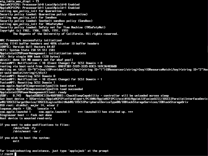 再起動、または電源ONした直後に command S を押しっぱなしにしてシングルユーザーモード(以後SUMと呼称)で起動します。